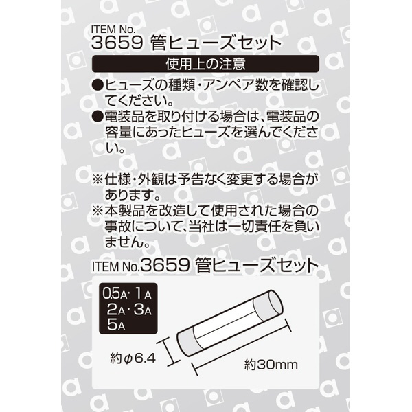 | 商品名 | 3659 管ヒューズセット 0.5/1/2/3/5A (約φ6.4×長さ約30mm)/各1本入り 3659 |