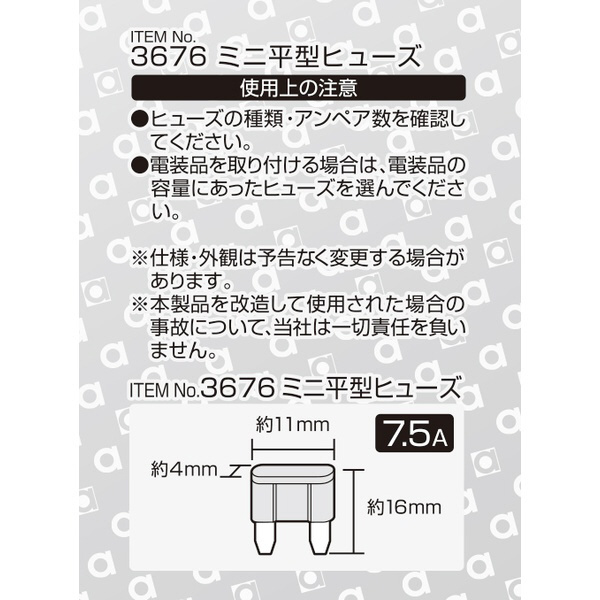 | 商品名 | 3676 ミニ平型ヒューズ 7.5A (約11×16×4mm)/5個入り 3676 |