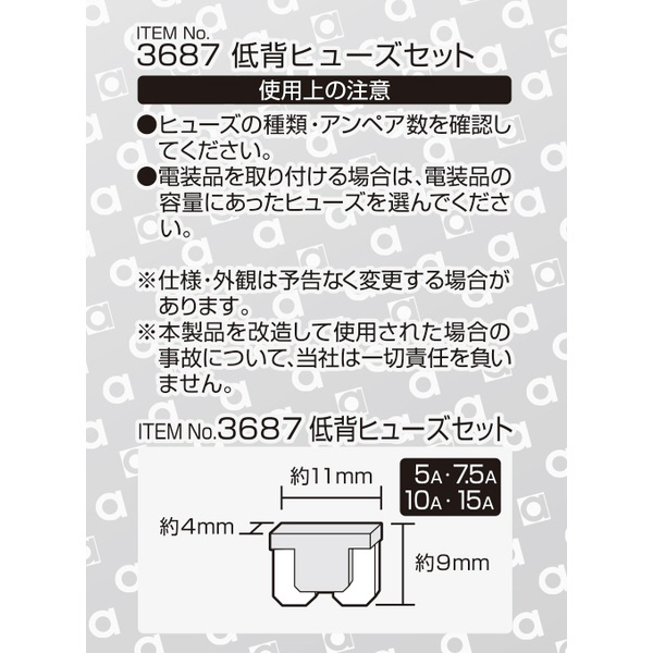 | 商品名 | 3687 低背ヒューズセット 5/7.5/10/15A (約11×9×4mm)/計5個入り 3687 |