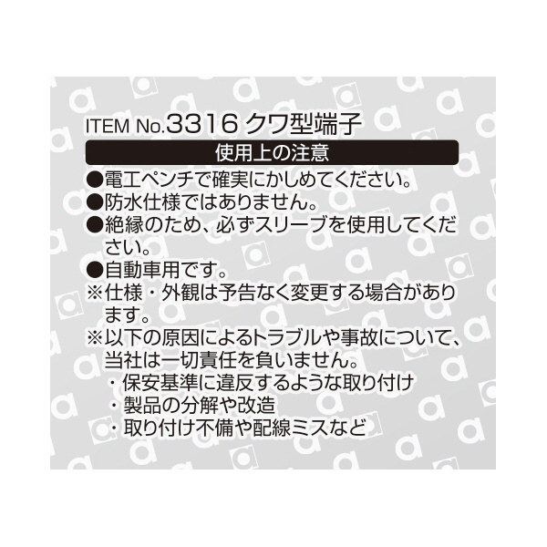 | 商品名 | 3316 クワ型端子 穴径φ6 AV(S)0.5〜2sq/8個入り 3316 |