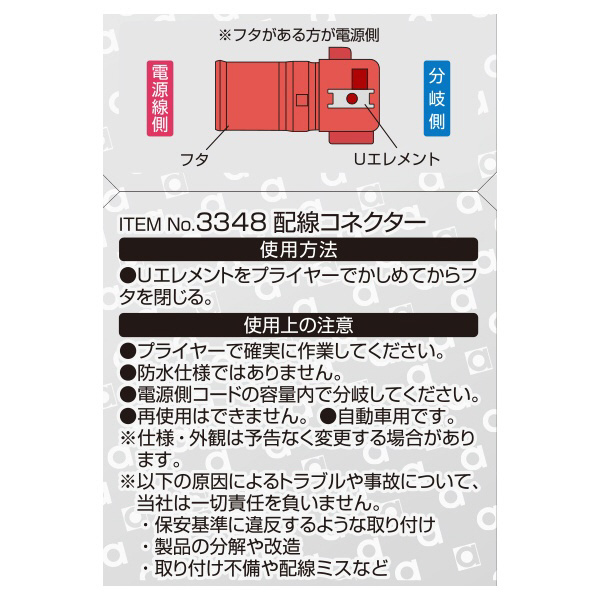 | 商品名 | 3348 配線コネクター 赤 0.35〜1.25sq相当(AWG22〜16)/6個入り 3348 |