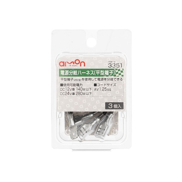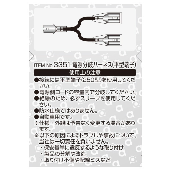 | 商品名 | 3351 電源分岐ハーネス(平型端子250型タイプ) AV1.25sq/3個入り 3351 |