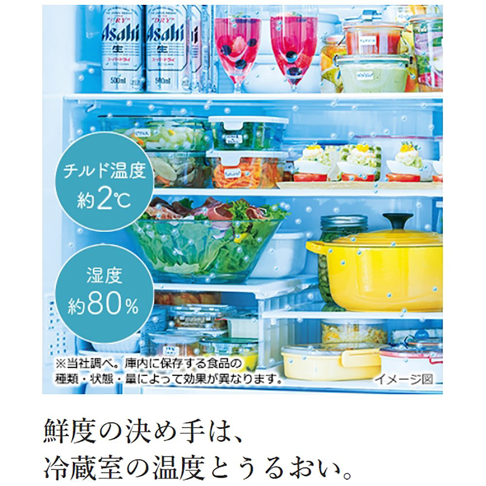 冷蔵室の棚がまるごとチルドルームだからまとめ買いした食品も置き場所に悩まずどこでも入れられます。週末に作った作り置きおかずもたっぷり保存でき、約2℃の低温だから食品の菌の繁殖を抑えて鮮度長持ち(※2)。また、湿度約80%(※3)のうるおい冷気でラップなしでも乾燥や変色を抑えておいしく保存(※2)することができます。