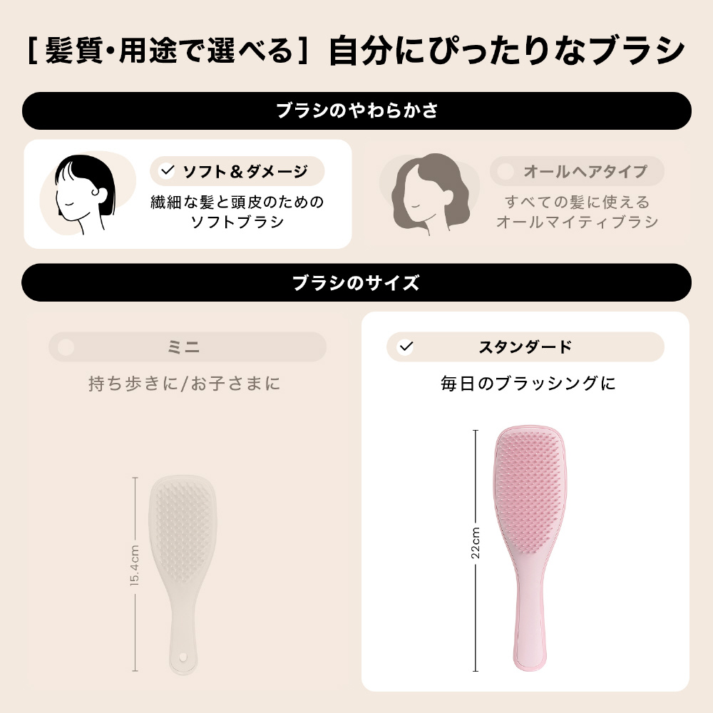 ダメージヘア用の濡れ髪専用ヘアケアブラシ。ブラシ部分がやわらかく、やさしい力加減で、髪の絡まりを少しずつ解きほぐすことが可能。より髪への負担がかかりにくくなっています。ヘアカラーやドライヤーの熱を繰り返し受けたダメージヘア、細くて繊細な髪の毛の方に最適です。ソフトな頭皮への当たり心地を求める方にもおすすめです。