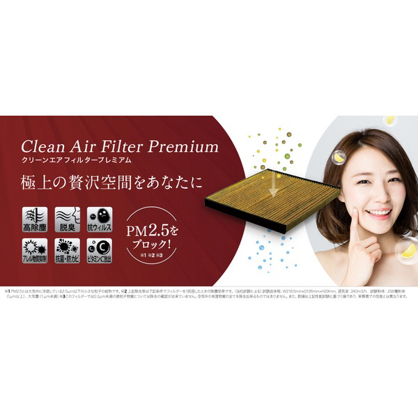 ●PM2.5や花粉の車内侵入をブロック!近年、問題となっている微小粒子物質「PM2.5」。花粉や黄砂よりも小さく、長期間の吸入による健康への影響が心配されています。デンソークリーンエアフィルターは「PM2.5」などの2.5μm粒子を約90%、1.0μm粒子を約65%、0.3μm粒子を約30%除去できるすぐれた性能を備えており、安心して外気を取り入れることが出来ます。