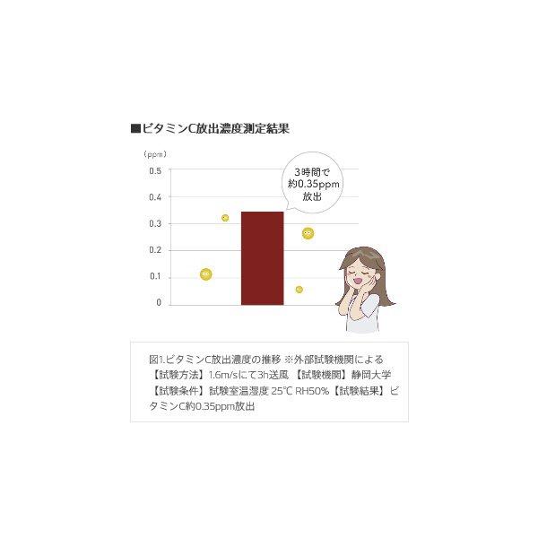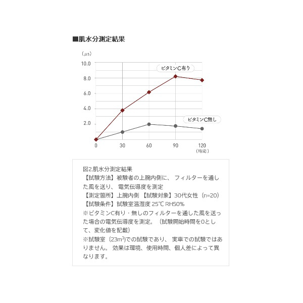 ※外部試験機関によるビタミンC放出濃度の推移【試験方法】1.6m/sにて3h送風 【試験機関】静岡大学【試験条件】試験室温湿度 25℃ RH50%【試験結果】ビタミンC約0.35ppm放出肌水分測定結果【試験方法】被験者の上腕内側に、 フィルターを通した風を送り、 電気伝導度を測定【測定箇所】上腕内側 【試験対象】30代女性(n=20)【試験条件】試験室温湿度 25℃ RH50%