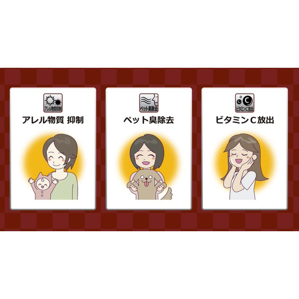 ●ダニや花粉などのアレル物質を90%以上抑制!黄色の層に塗布されたアレル物質抑制剤が、ダニの死がいや花粉などのアレル物質を24時間で90%以上抑制します。 アレル物質への抵抗力が弱い赤ちゃんでも快適・安心に過ごせる空間作りをサポートします。【試験方法】サンドイッチELISA法【試験条件】サンプルサイズ:8mm×8mm、アレル物質濃度:スギ花粉(Cryj1)=1ng/ml、ダニ(Derf2)=100ng/ml、アレル物質溶液量:0.3ml(Cryj1,Derf2ともに) 、アレル物質接触時間:24時間【試験結果】24時間で90%以上抑制