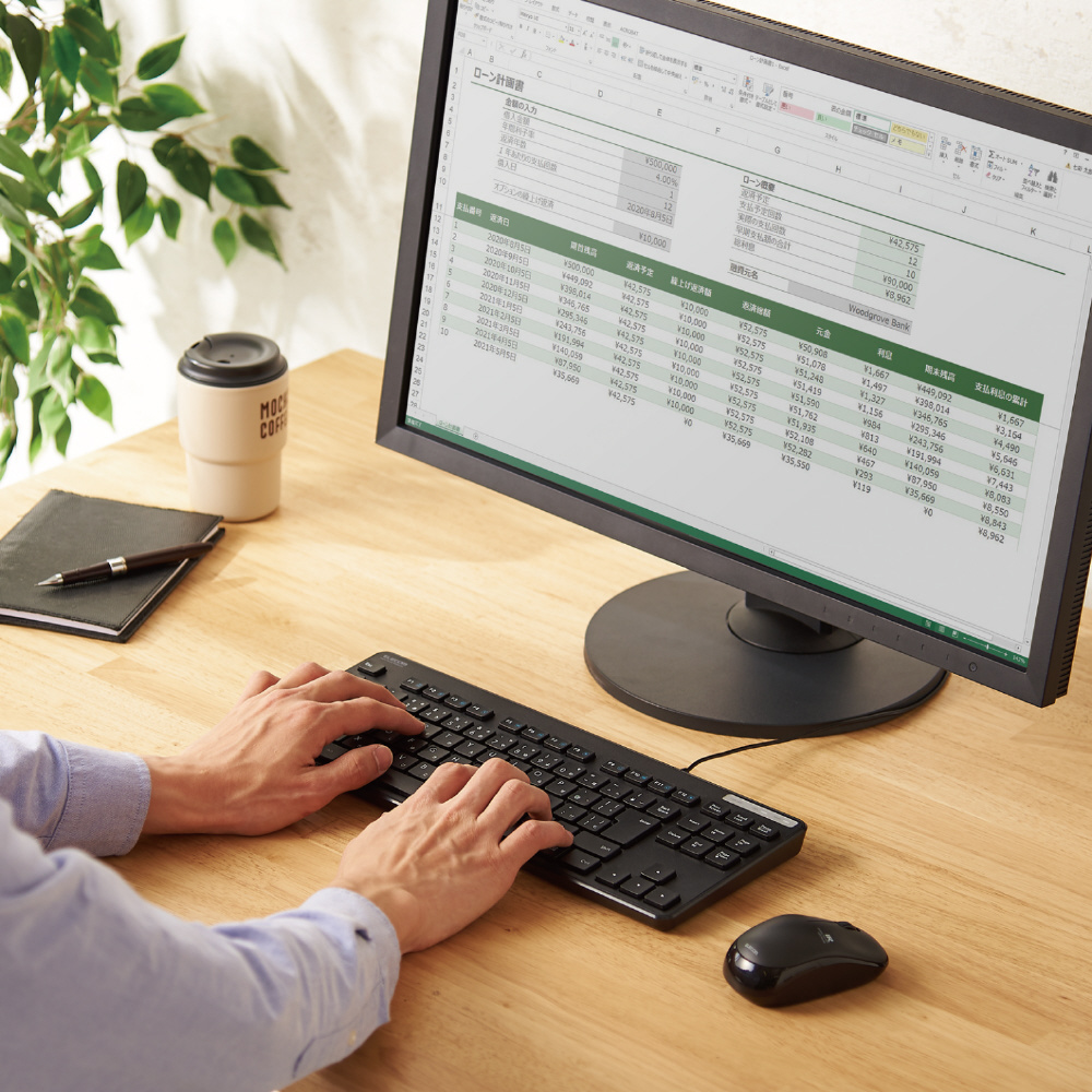 日々のパソコン操作に安心をプラスする抗菌仕様! サクサク軽い打ち心地で、PCに挿すだけで使える有線薄型テンキーレスキーボード。