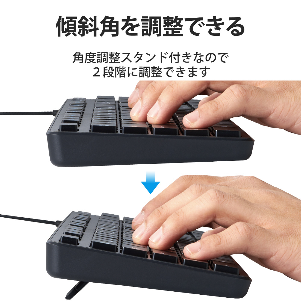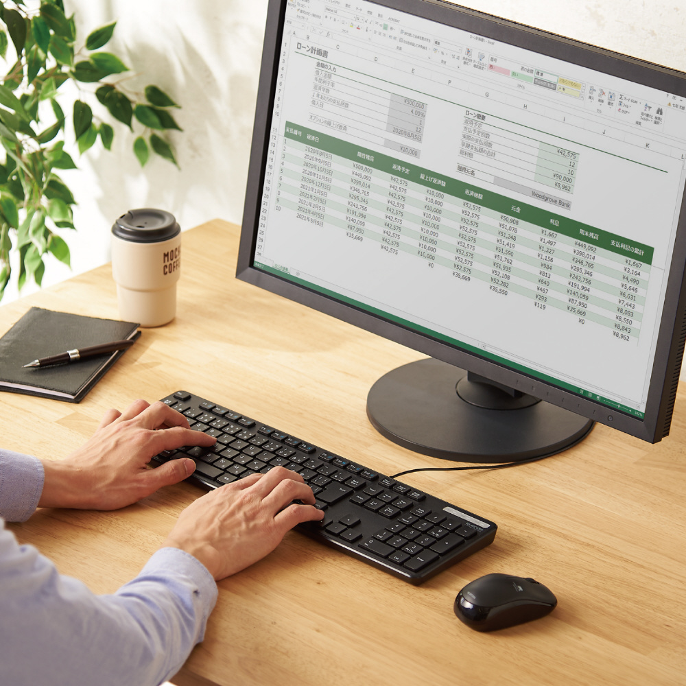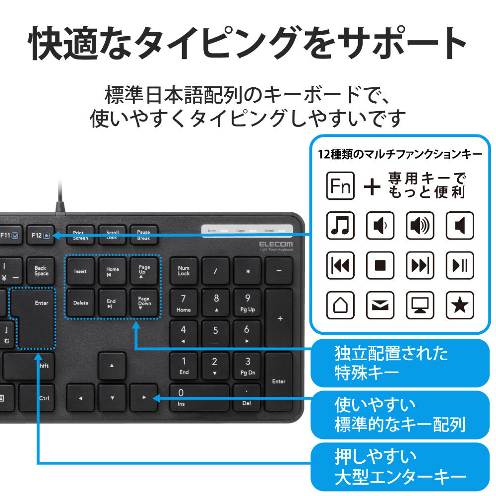 日々のパソコン操作に安心をプラスする抗菌仕様! サクサク軽い打ち心地で、PCに挿すだけで使える有線薄型フルキーボード。