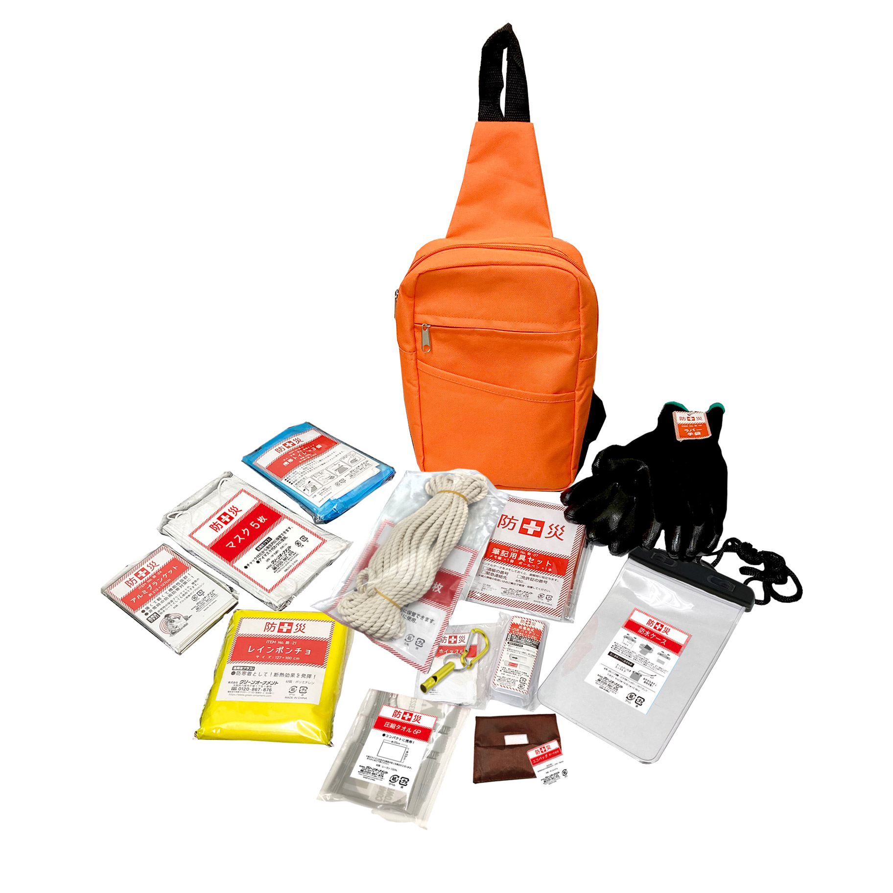 1,ボディバッグ 2,マスク5P 3,携帯トイレセット3P 4,アルミブランケット 5,ホイッスル 6,ラバー手袋 7,乾電池式USBバッテリー 8,圧縮タオル6P 9,防水スマホケース 10,レインポンチョ 11,エコバッグ 12,筆記セット 13,綿ロープ