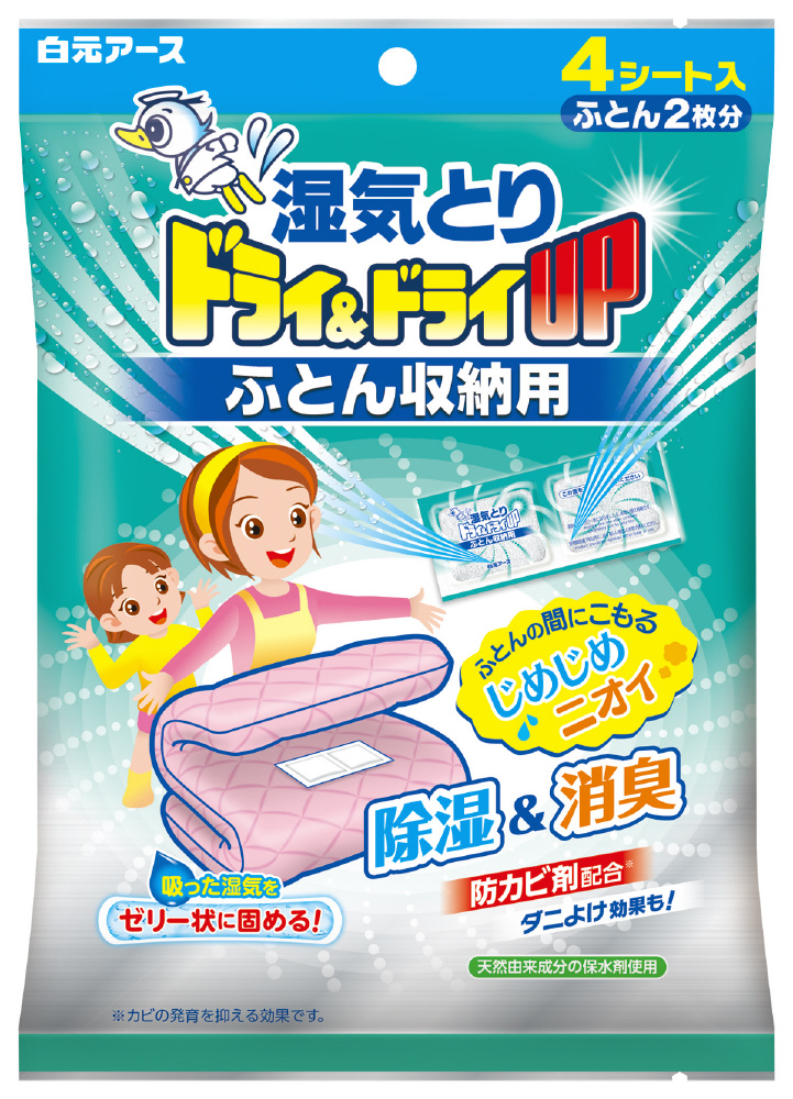 吸った湿気をゼリー状に固め、取替え時期をお知らせする湿気とり。収納時のふとんのじめじめとイヤなニオイを消臭します。カビから守る防カビ成分配合。ダニよけ効果付き。天然由来成分の保水剤使用。
