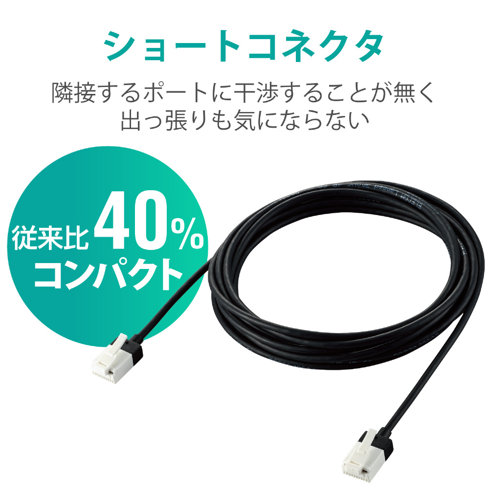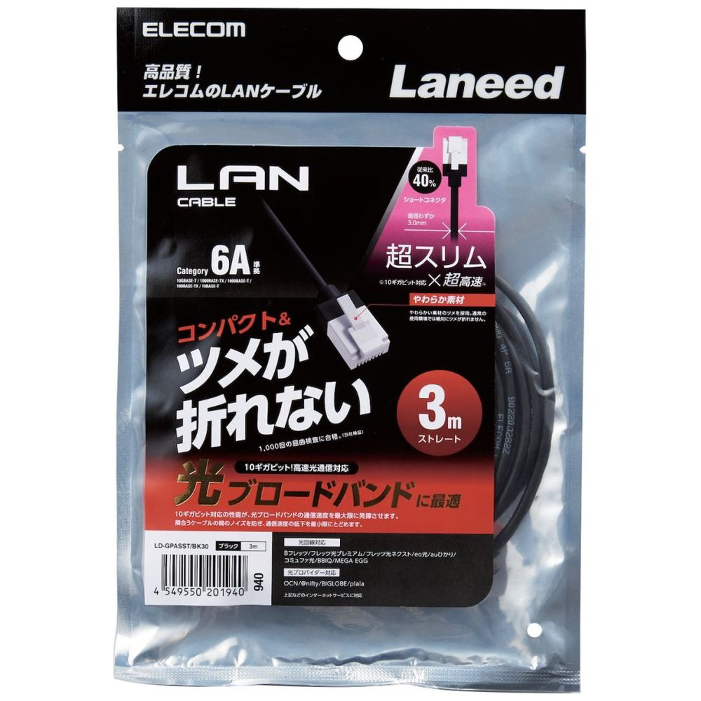 新素材コネクタ採用で通常の使用環境では絶対にツメが折れない!周波数帯域500MHzを保証する10ギガビット・イーサネットに対応。直径わずか3.0mmのスーパースリムケーブルと従来比約40%のショートコネクタを採用したカテゴリー6A準拠のLANケーブル。※1000回の屈曲検査合格(当社検証)