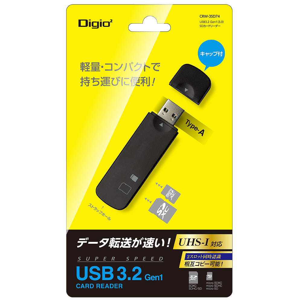 USB3.2Gen1規格の スティック型カードリーダー。最大104MB/sのUHS-Iスピードクラス 対応。