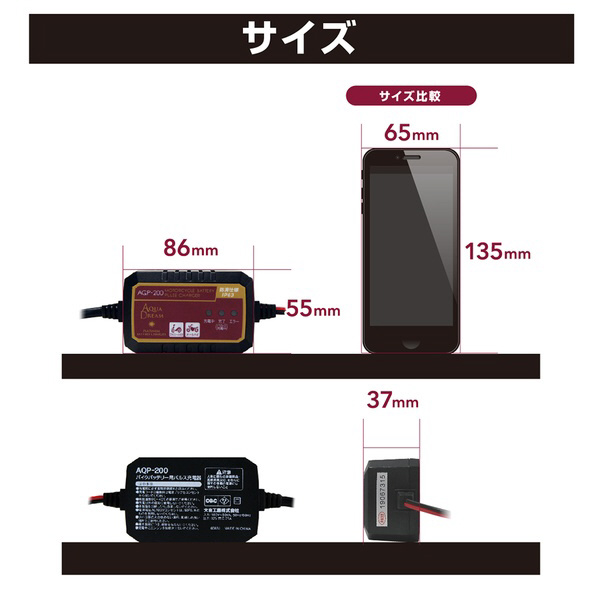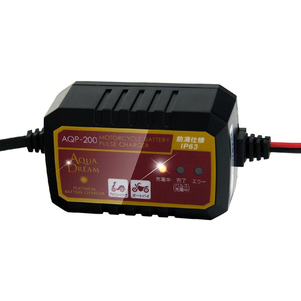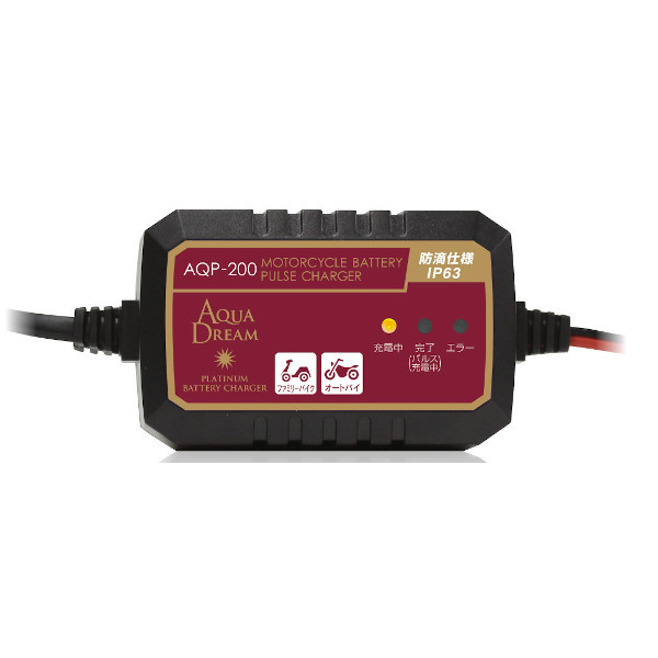 | 商品名 | バッテリー充電器 バイク用バッテリーパルス充電器 (3年保証) 全自動マイコン制御 DC12V専用 定格0.75A(ファミリーバイク・オートバイ用) AQP-200 |