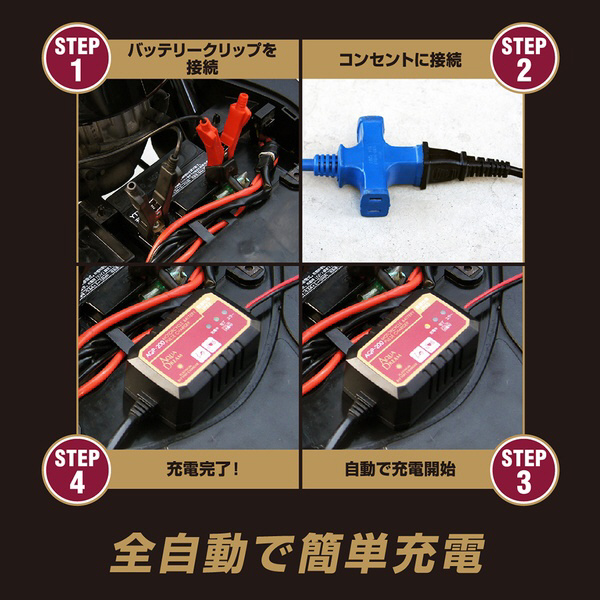 ●バイク等のバッテリーを外さず繋いでコンセントを差し込むだけで誰にでも簡単に充電が出来ます。