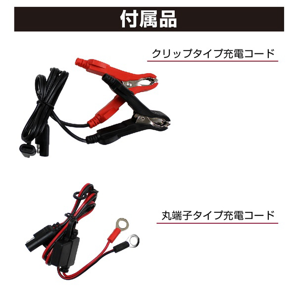 ●クリップ・丸端子タイプ充電コード付きにて簡単に充電できます。※丸端子充電コードはバッテリーに常時接続可能です。