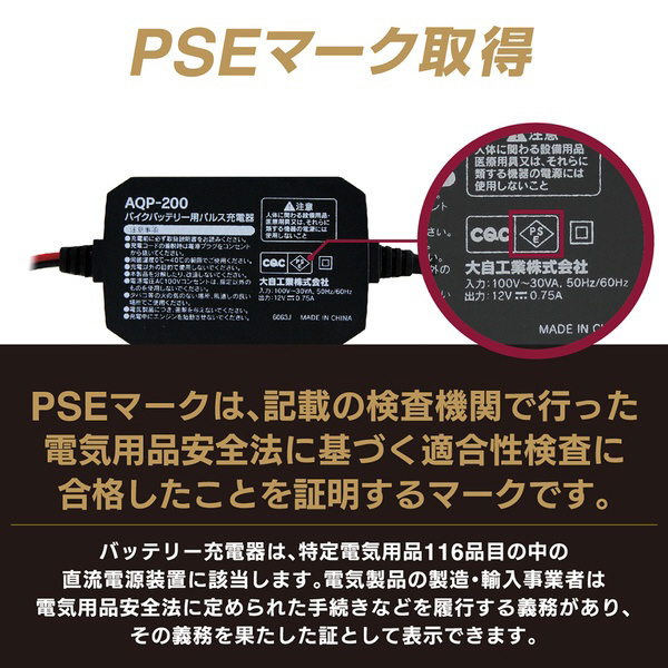 バッテリー充電器 バイク用バッテリーパルス充電器 (3年保証) 全自動マイコン制御 DC12V専用 定格0.75A(ファミリーバイク・オートバイ用) AQP-200