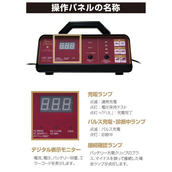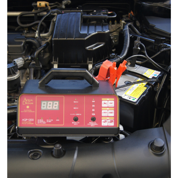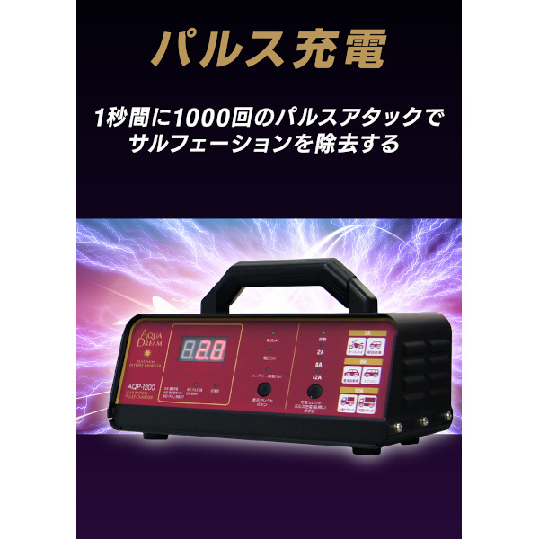 バッテリー充電器 自動車用バッテリーパルス充電器(3年保証) 全自動マイコン制御 DC12V専用 定格15A(バイク〜軽自動車・コンパクトカー・ミニバン・SUV・小型大型トラック等) AQP-1200