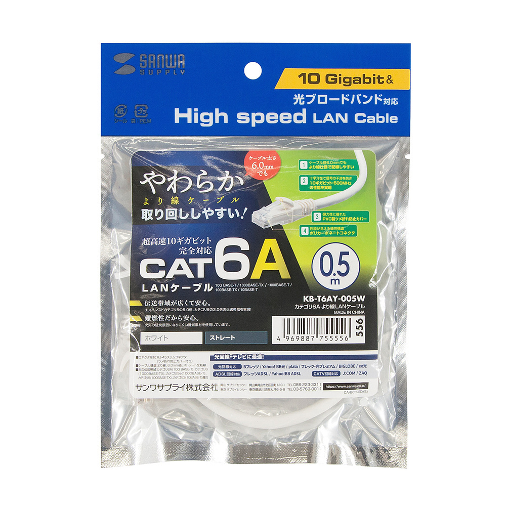 | 商品名 | KB-T6AY-005W LANケーブル PoE対応 ホワイト [0.5m /カテゴリー6A /スタンダード] |