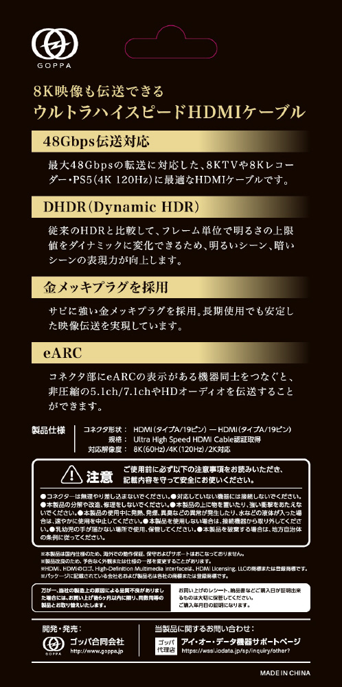 本製品は、8K/60Hz・4K/120Hzの映像高速伝送に対応したHDMIケーブルです。