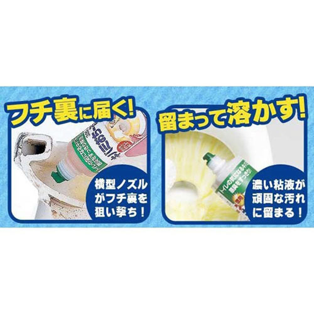 横向きノズルなので便器のふちの裏側まで液がかけやすく、 尿石表面に長時間付着する粘液で留まって溶かします!