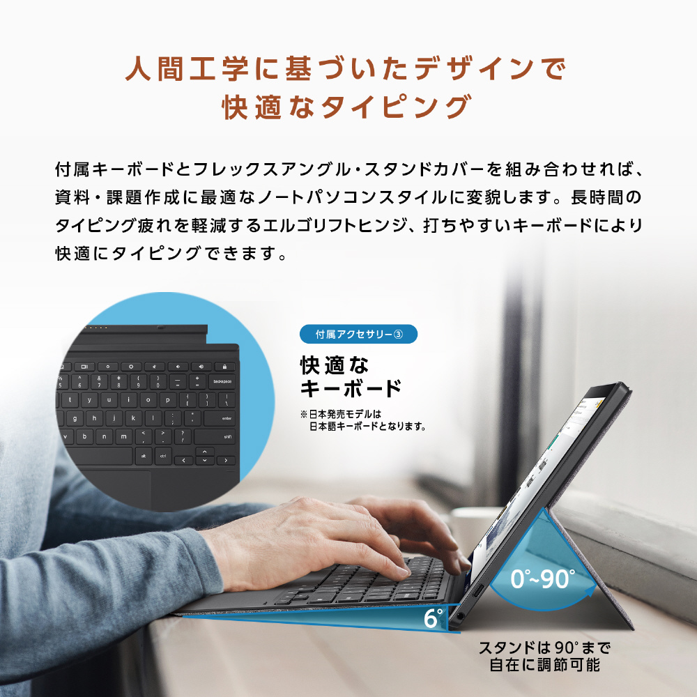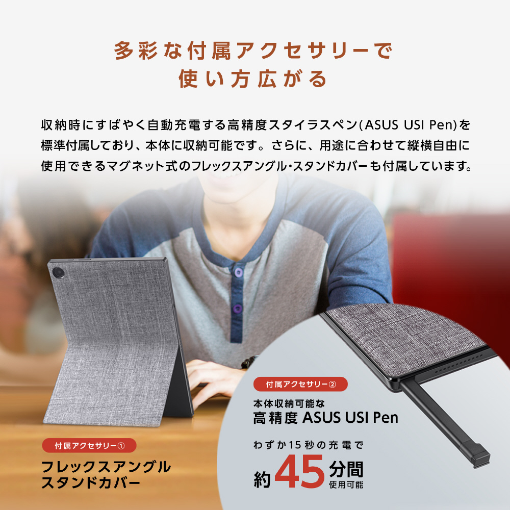ASUS Chromebook Detachable CM3には、収納時にすばやく自動充電する高精度スタイラスペンを標準付属。本体に収納可能で、メモやスケッチはもちろん、アイデアがひらめいたときにさっと取り出して使用できます。