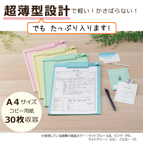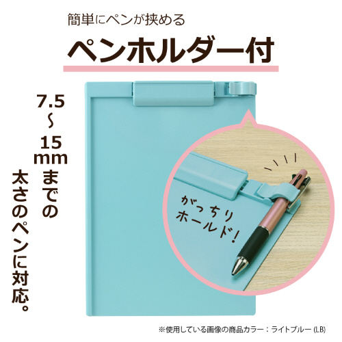 フラットクリップ採用の超薄型軽量タイプ(適正収容枚数コピー用紙約30枚)太軸ペンホルダー付(軸系7.5?15mmまでのペンに対応します。)