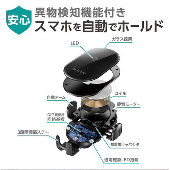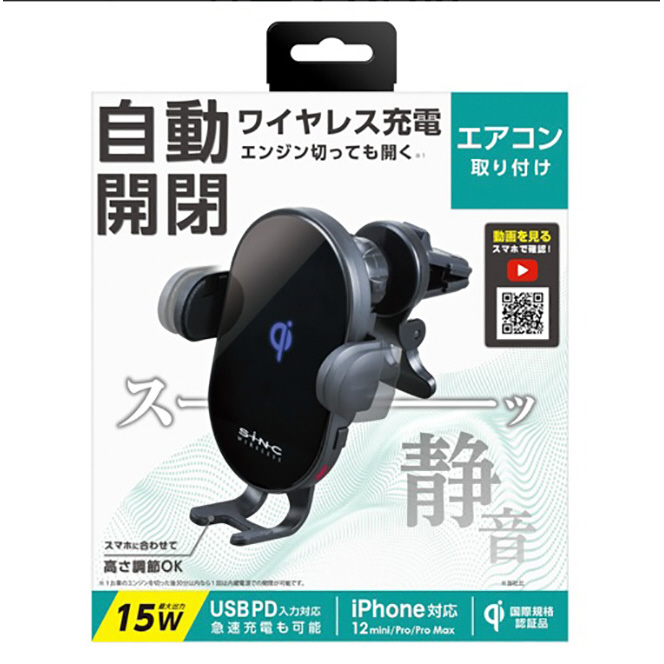 Qi正規認証取得済みの自動開閉アーム付きQi15W充電可能なスマートフォン車載ホルダーです。