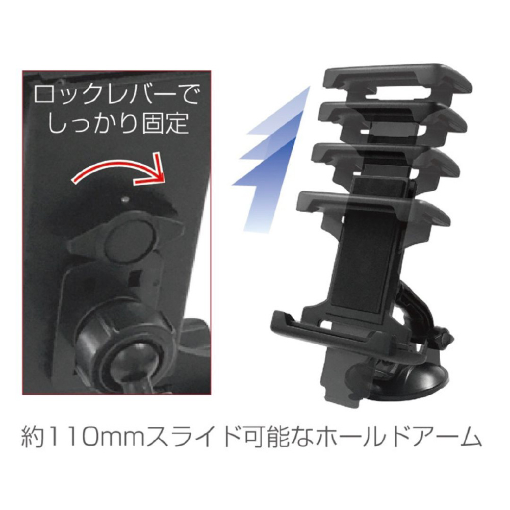 約12mm前後に可動するアームで手帳型ケースをしっかりホールド