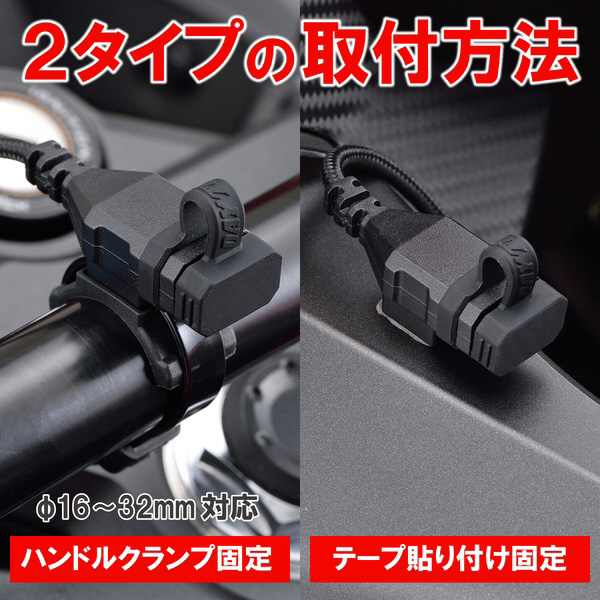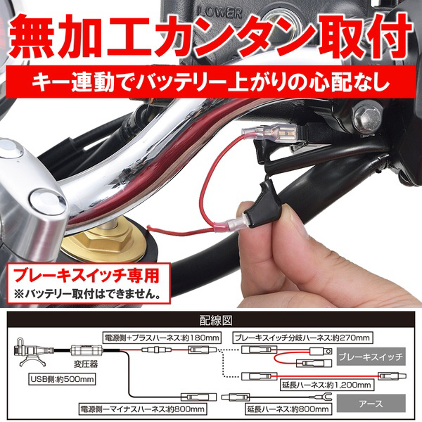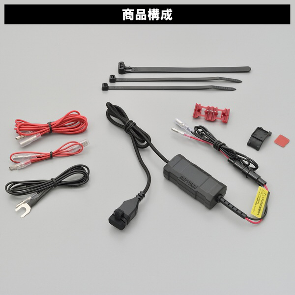 ■付属品:ハンドルクランプベース×1/ブレーキスイッチ分岐ハーネス×1/延長ハーネス×1/アース線×1/結線コネクタ×1/リリースタイプ結束バンド×1/結束バンド×2/両面テープ×1