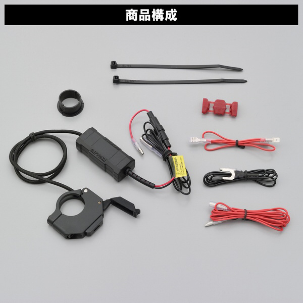 ■付属品:ハンドルクランプベース×1/ブレーキスイッチ分岐ハーネス×1/延長ハーネス×1/アース線×1/結線コネクタ×1/結束バンド×2