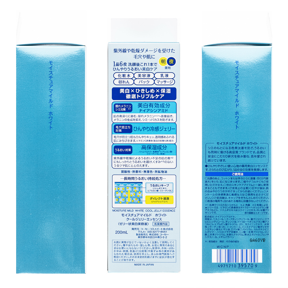 | 商品名 | MOISTURE MILD(モイスチュアマイルド)ホワイト クールジェリーエッセンス 200ml 【864】 |
