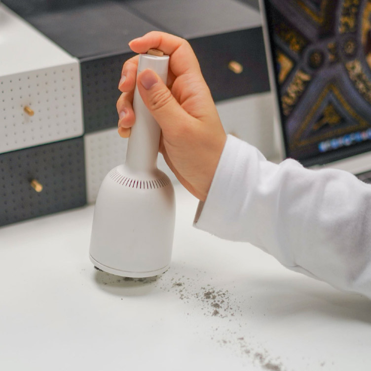 握りやすいデザインで、おしゃれなインテリアにも馴染む卓上掃除機。毛玉取り器にもなるので、テーブルの消しカス掃除から毛玉取りまで活躍。