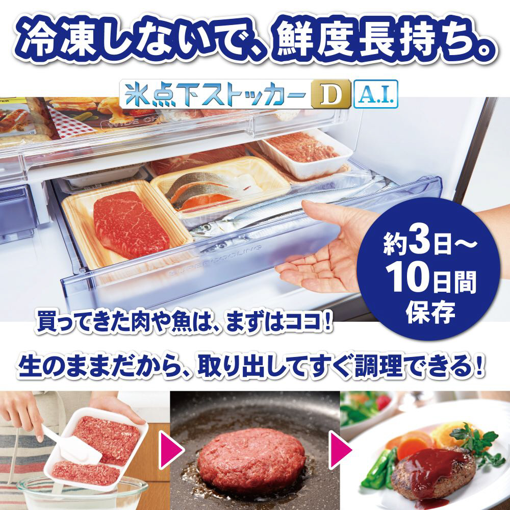 「氷点下ストッカーD A.I.」は、AIが家庭ごとの冷蔵庫の使い方を学習し、今後の使い方を予測。ユーザーの使い方に合わせて温度制御を行うことで、肉や魚を生のまま、おいしく長くストックできます。だから、生鮮食品のまとめ買いもでき、週末に使う分は冷凍がいりません。また、生のままだから解凍の手間が不要で、取り出してすぐに調理ができます。さらに、冷凍した食材を朝、氷点下ストッカールームに入れておけば、夕方にはドリップを抑えておいしく解凍できます。