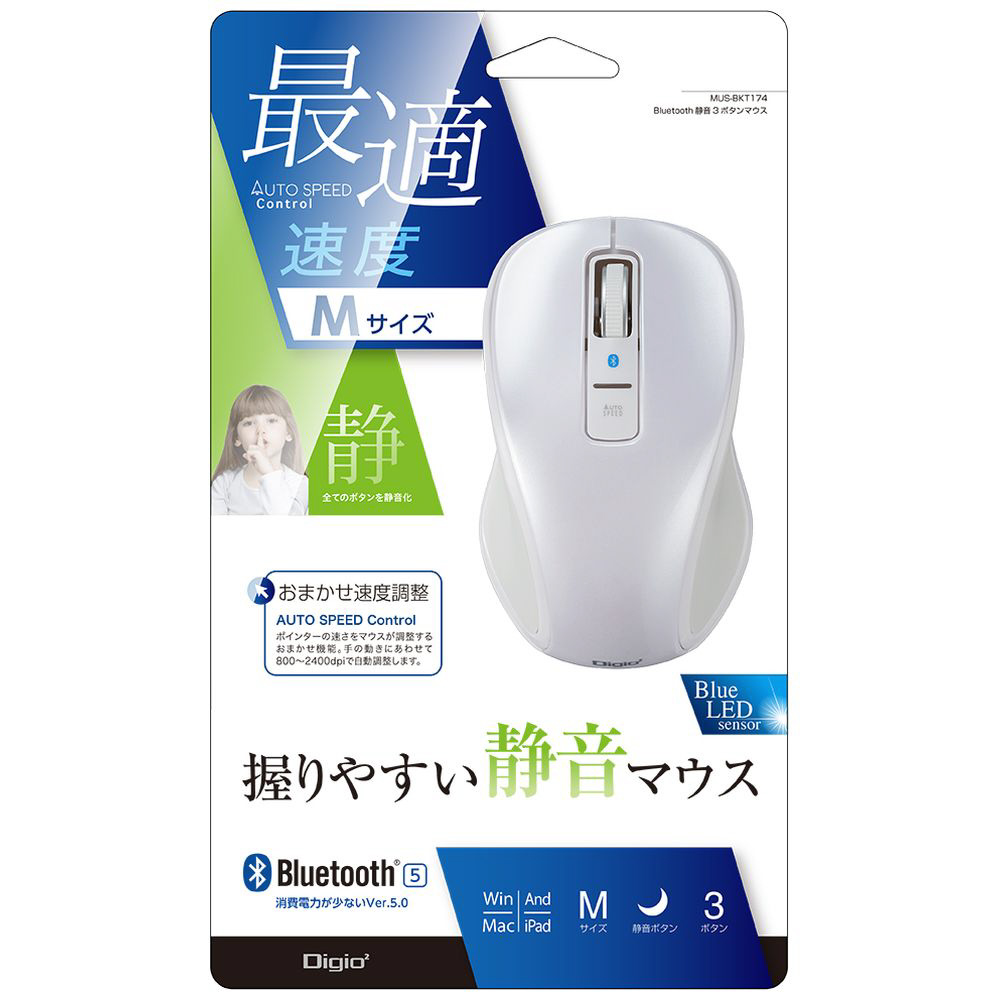 Bluetooth5.0静音3ボタンBlueLEDマウス ホワイト [BlueLED /3ボタン /Bluetooth /無線(ワイヤレス)] MUS-BKT174W