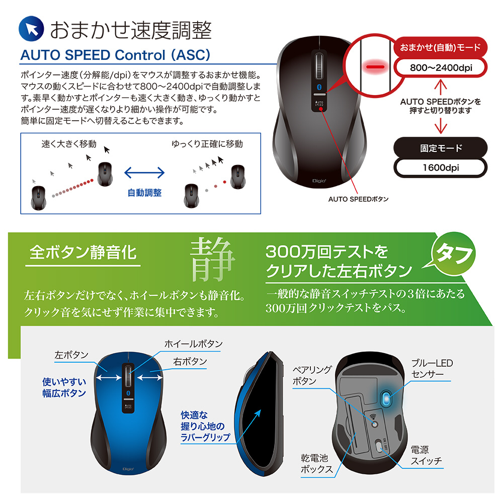 「Bluetooth5 静音3ボタンBlueLEDマウス」
