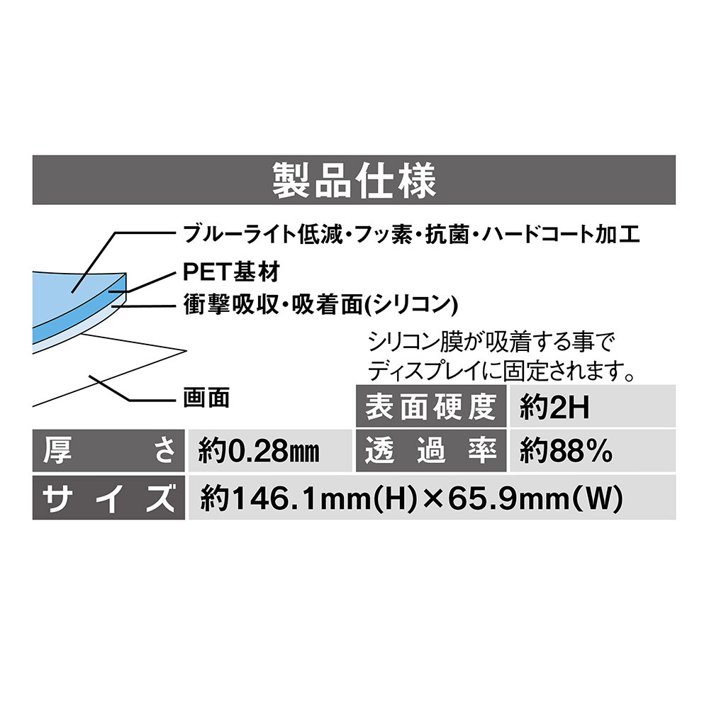 | 仕様2 | フルスペックフィルムのため、ブルーライトカット・フッ素抗菌・ハードコート加工されています。 |