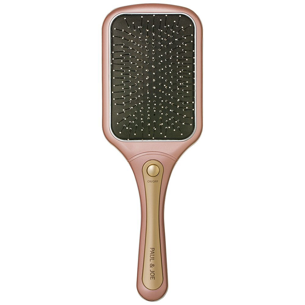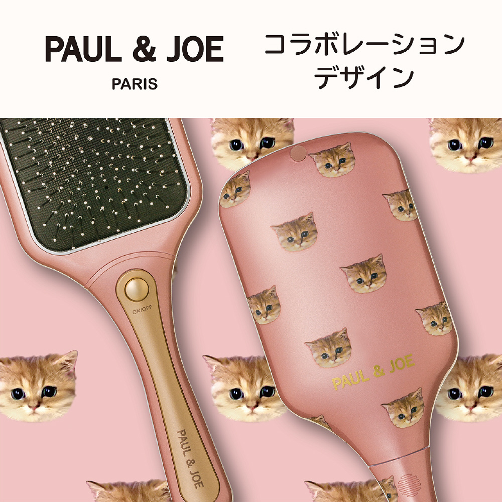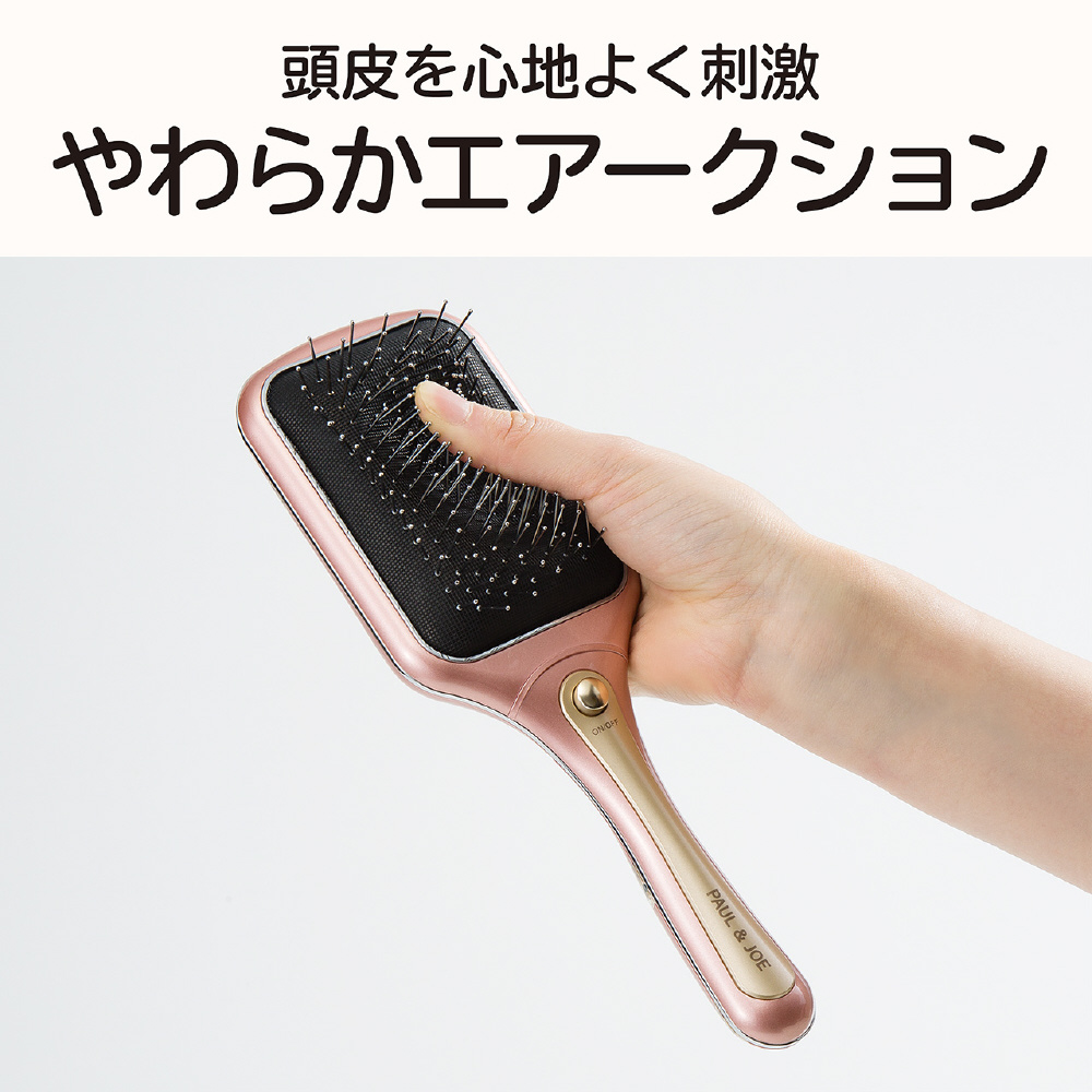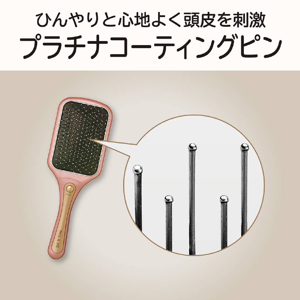 PAUL&JOE×リセットブラシのコラボモデル。両サイドのアースを持つことで髪の静電気を抑制。音波振動で髪のからまりを軽減。強力磁気2000ガウス。頭皮への刺激にも使いやすい大判ブラシ。
