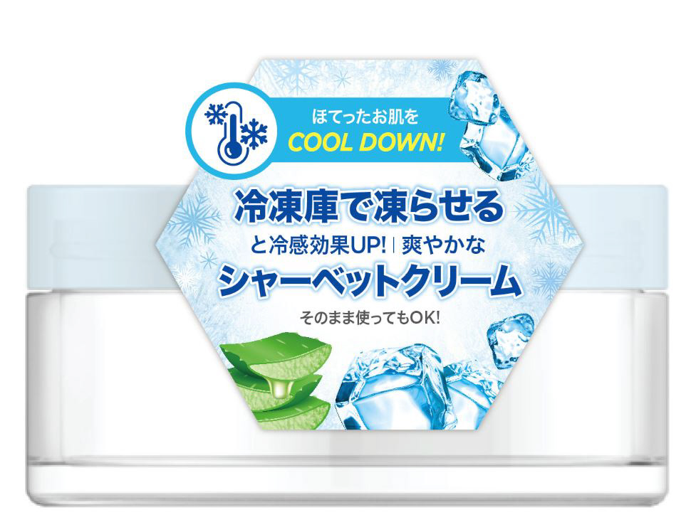 常温と冷蔵庫ではリッチななめらかクリーム、冷凍庫ではシャリシャリとしたシャーベット状に変わり、好きな塗り心地で使えます。べたつかない爽やかなジェルがお肌に触れた瞬間そろりと溶けて、ほてったお肌を即刻クールダウンさせます。
