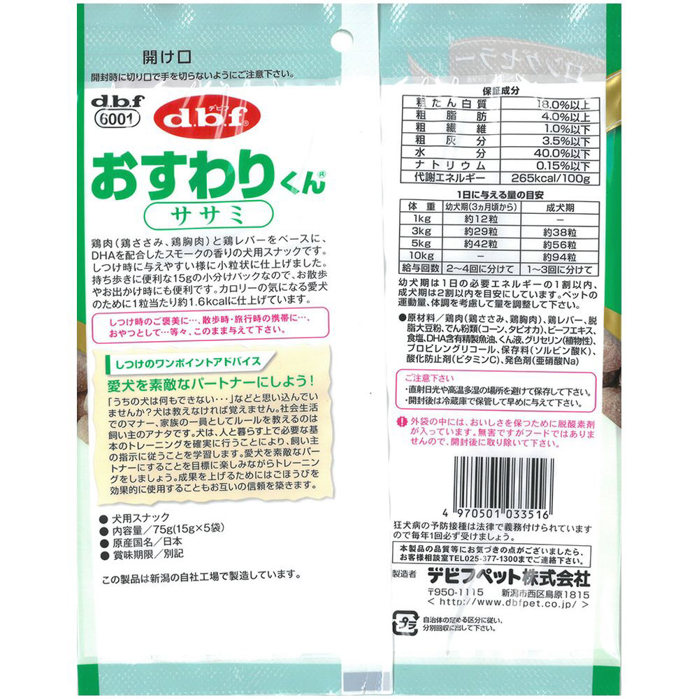 鶏肉(鶏ささみ、鶏胸肉)と鶏レバーをベースに、DHAを配合したスモークの香りの犬用スナックです。