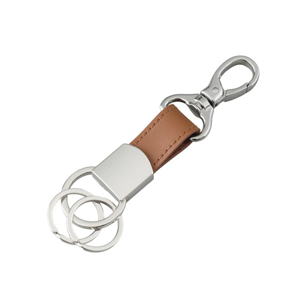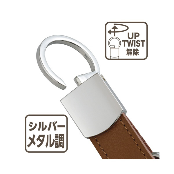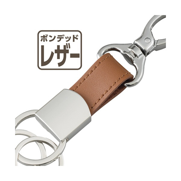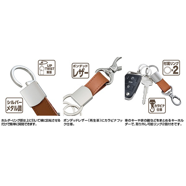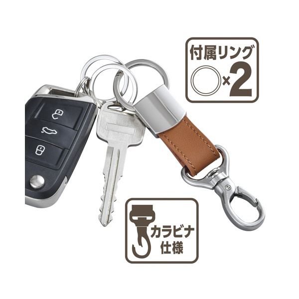 車内用品 キーホルダー シルバーメタル調 カラビナフック ボンデッドレザー 取り外しリング2個付き ブラウン WA77