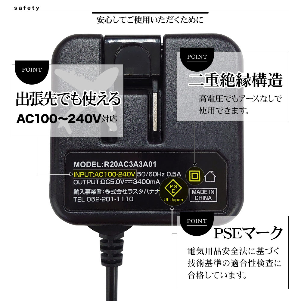 | 仕様1 | USB-Aポート×3 入力:AC100-240V 50/60Hz 出力:1ポート最大 5V/3.4A 3ポート合計 5V/3.4A 本体重量:約127g ケーブル長:約2m 梱包内容:AC充電器×1 固定用シール×1 |