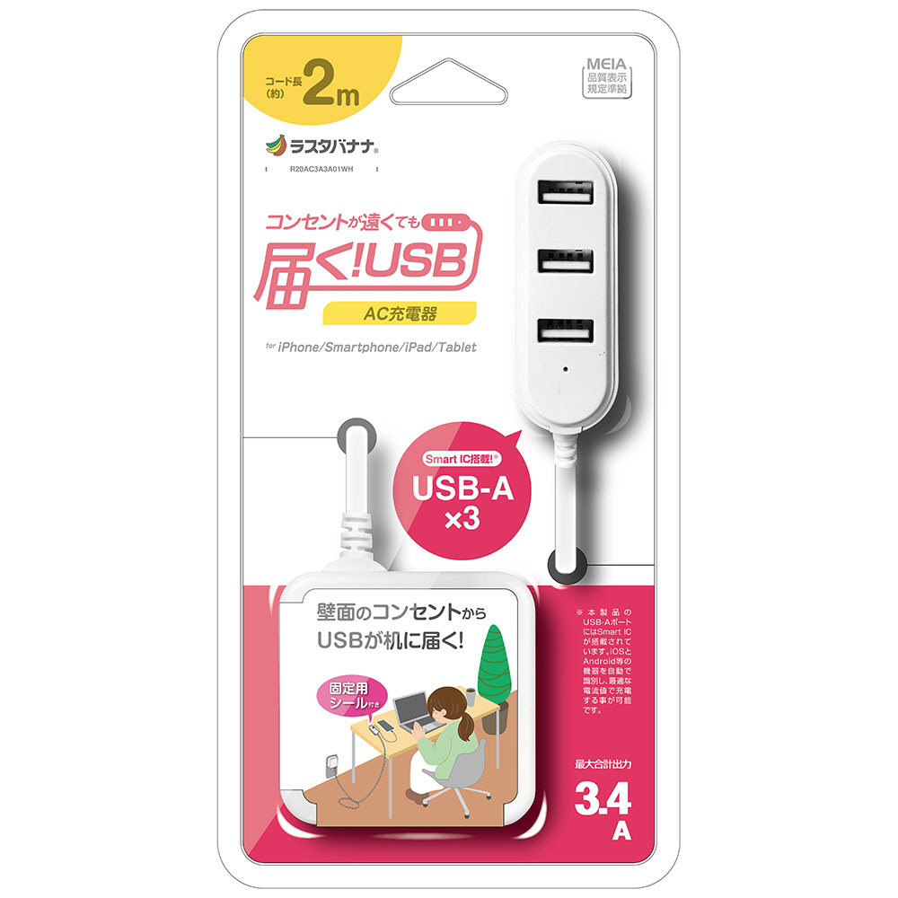 | 商品名 | AC - USB充電器 タブレット・スマホ対応 3.4A [2m /3ポート:USB-A] ホワイト R20AC3A3A01WH |