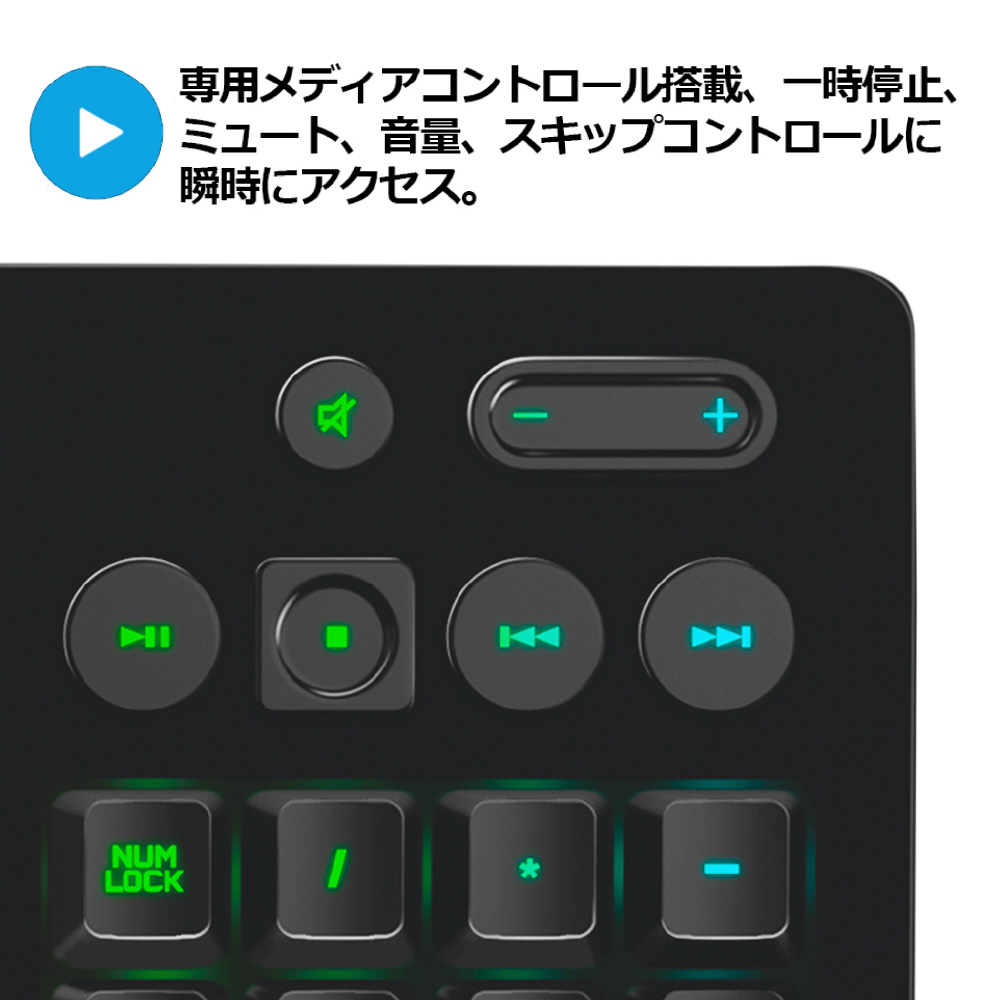 耐久性とゲーミンググレードのパフォーマンス。タクタイルMech-Domeキースイッチは耐水性です。カスタマイズ可能なLIGHTSYNC RGBライト。一体型のパームレストと調節式フィート。専用メディアコントロール。