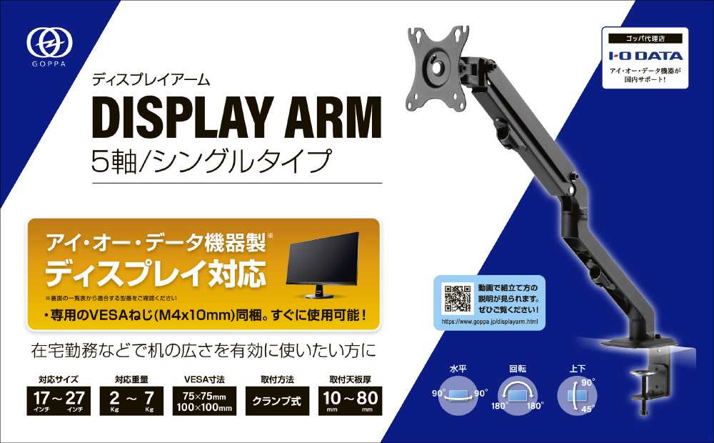 | 商品名 | モニターアーム [1画面 /17〜27インチ] 鉄製 可動式 クランプ式 ブラック GP-DPAS1 |