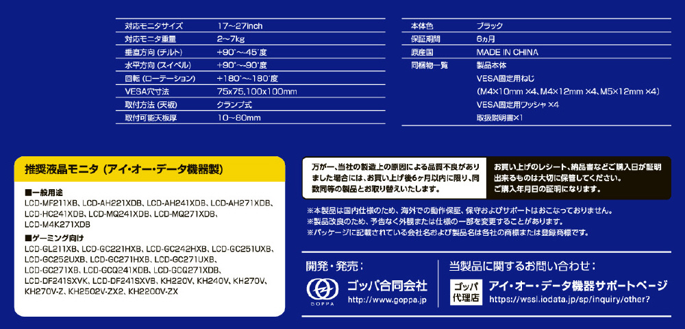 最大耐荷重7Kg、IODATA製の27型までの製品に全て対応
