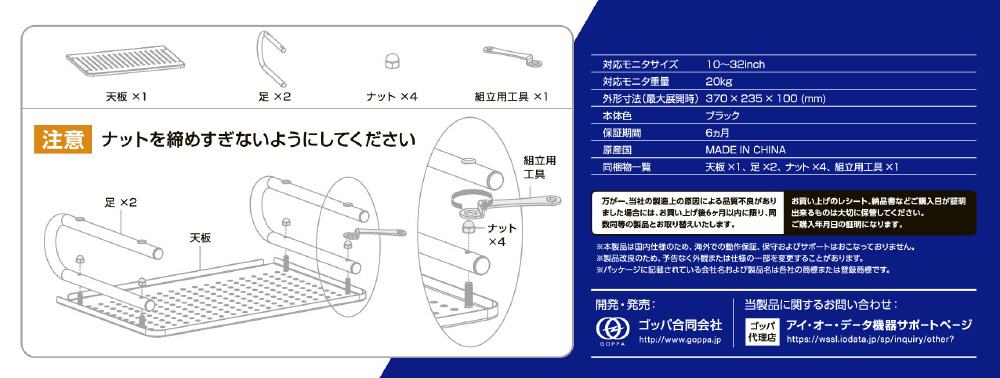 | 仕様1 | [対応モニタサイズ]10〜32 inch [対応モニタ重量]20 kg [下部の収納]幅330mm、奥行235mmのPCまで下部に収納可能(目安:13.3型ノートPCまで) 外形寸法(最大展開時):370×235×100 mm 本体質量:約1.1 kg 材質:鉄 同梱物一覧:天板×1、足×2、ナット×4、組立用工具×1 |