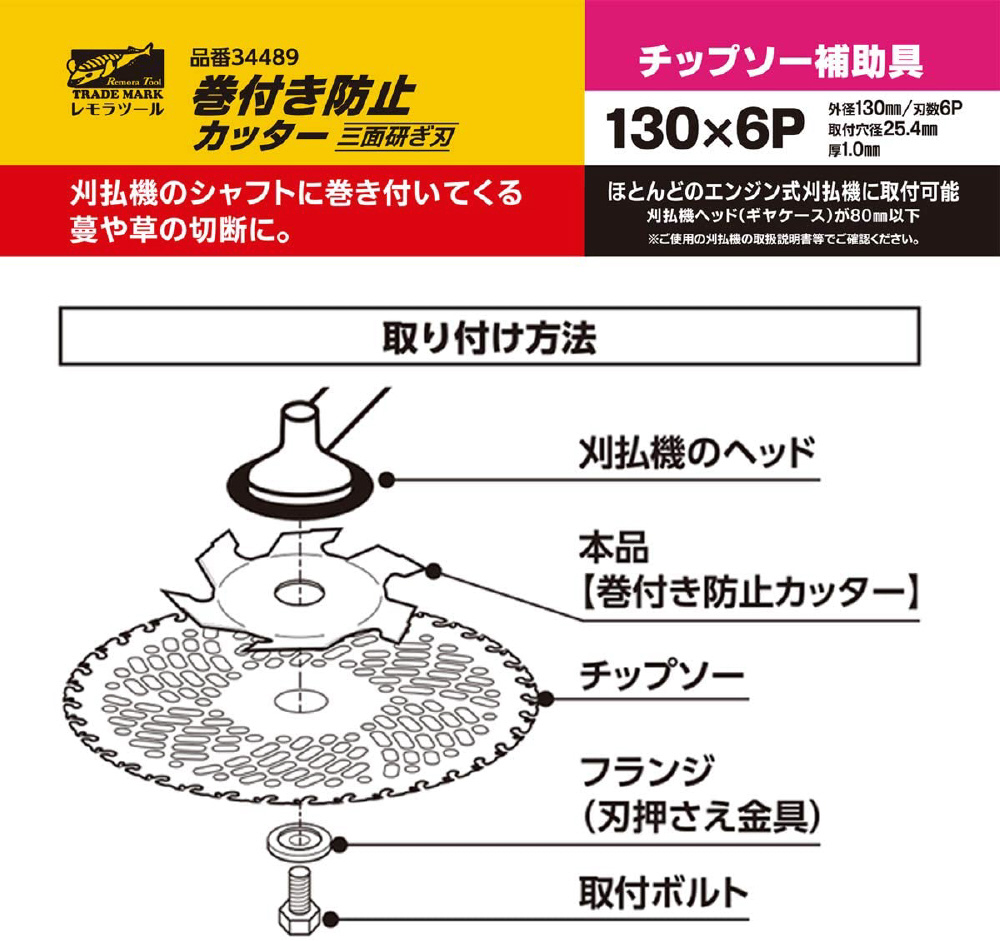 外径130mm、刃数6P、取付穴径25.4mm、厚1.0mm。ほとんどのエンジン式刈払機(草刈り機)に取付け可能。刈払機ヘッド(ギヤケース)が80mm以下に使用可能。本品は焼入れ処理を施しております。刃の切れ味が落ちてきたらダイヤモンドヤスリで研磨すれば切れ味が回復します。 グラインダーは使用せず、手動のヤスリをご使用ください。