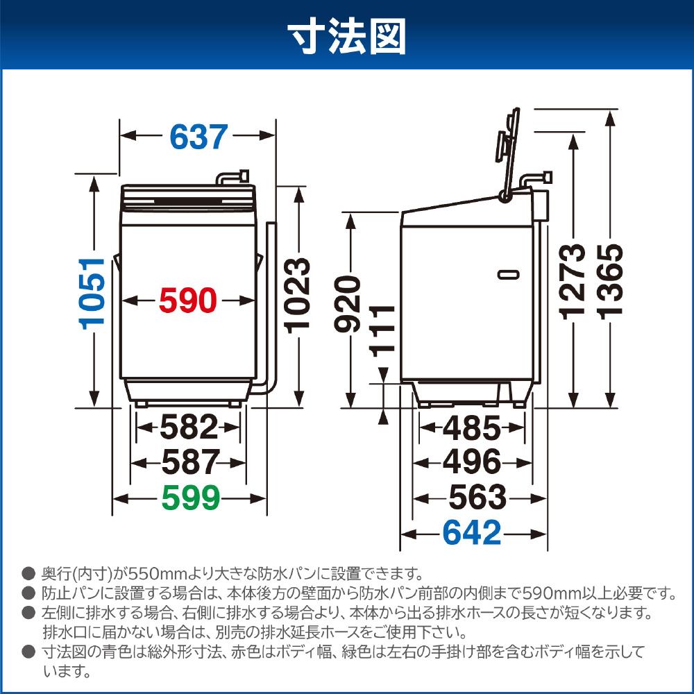 | 設置可能防水パン | 内寸奥行550mm以上 |