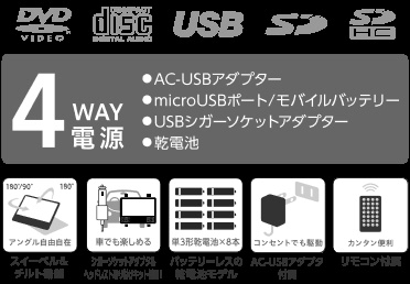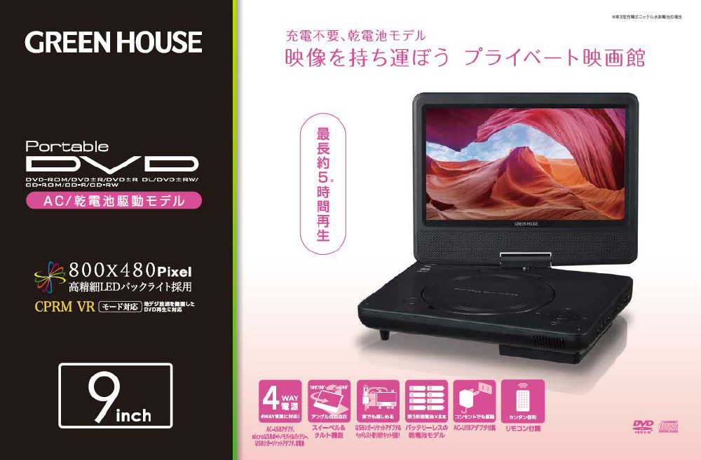 充電不要の乾電池対応 9型ワイドポータブルDVDプレーヤー